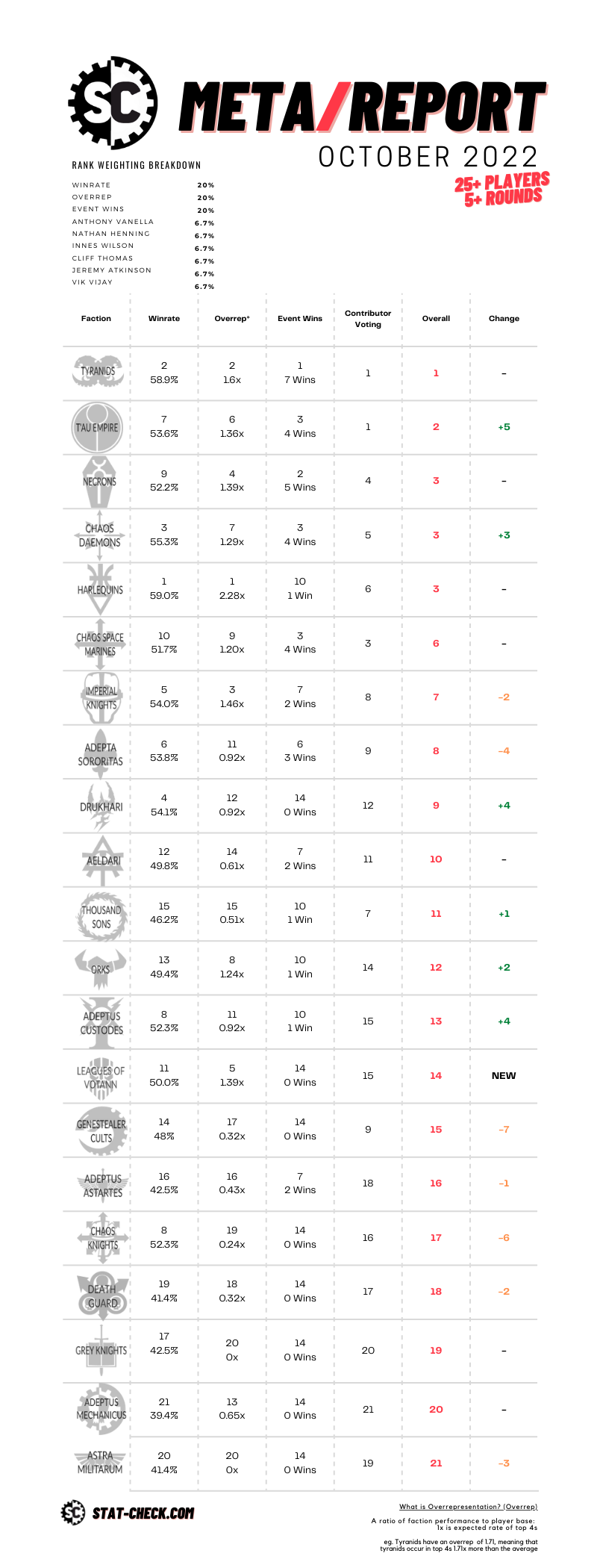 Working with 6” less isn’t the most pleasant place to be, but technically Harlequins don’t fall any spaces this month with tied 3rd. With an insultingly high overrepresentation, the top players of this faction are still putting down results out of order with their event wins. 59% win rate is the top of the meta right now, but this report contains a few weeks of pre-dataslate. Certainly losing speed will affect them, and we feel their general position in the meta has fallen to 5th in the contributor voting. Can Twilight emerge from the book to prove a third great subfaction as the only survivor of the nerf massacre?