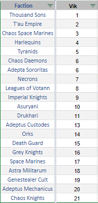 With one of the lowest overreps, at 0.24, Chaos Knights do about a quarter as well as expected. With what is amounting to a very one dimensional codex that people have more and more experience against, no event wins and low contributor faith, Chaos Knights fall deeply below their Imperial Brethren. The Magaera with updated keywords is making some waves in the faction and might open up some new options, but that remains to be seen in results.